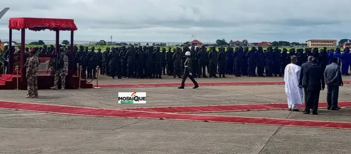 Cependant tout est presque mis en place ici. Le tapis rouge étalé, et le jet SX-CJA estampillé Branding Guinée, à bord duquel il doit voyager, est bien positionné au niveau du tarmac, les forces de défense de sécurité, pour la revue de troupe y sont également bien positionnées.