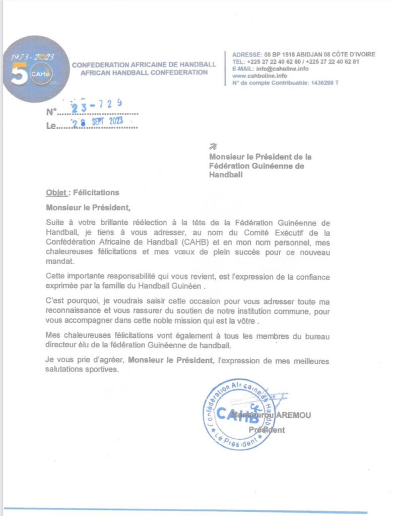 Le Président de la Confédération Africaine de Handball, Dr Mansourou Aremou a adressé ses chaleureuses félicitations au Général Mamadouba Paye Camara pour sa brillante réélection à la tête de la Fédération Guinéenne de Handball.